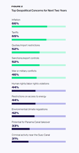 - Top threats: Inflation (66%) and tariffs (65%) lead the list of geopolitical concerns, followed by import restrictions, sanctions, and military conflict.