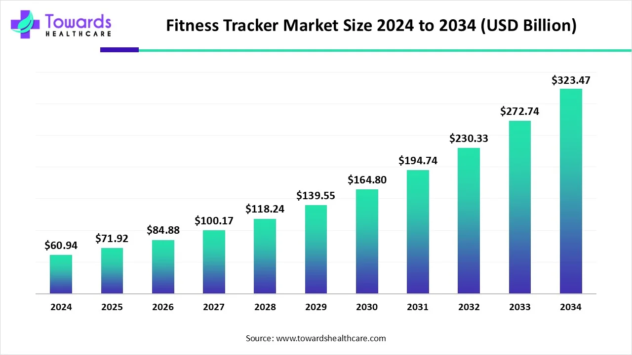 Ottawa, Nov. 04, 2025 (GLOBE NEWSWIRE) -- The global fitness tracker market size was valued at USD 60.94 billion in 2024 and is predicted to hit around USD 323.47 billion by 2034, rising at a 18.04% CAGR, a study published by Towards Healthcare a sister firm of Precedence Research.
